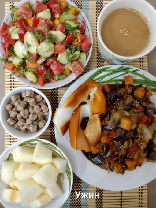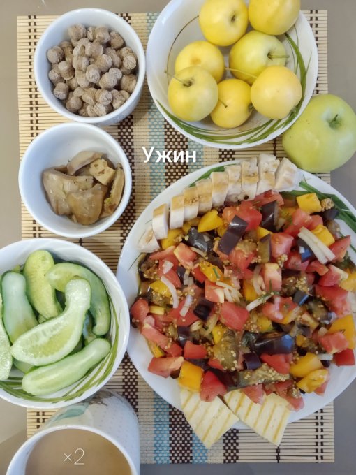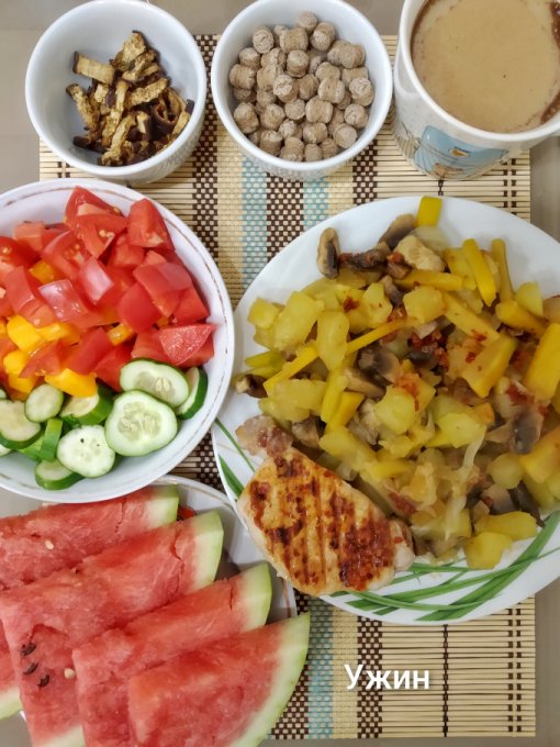 Ужин: свинина на гриле, овощи тушеные с шампиньонами, аджика, овощной салат с маслом, сушеные баклажаны, ржаные отруби, арбуз🍉, кофе с молоком.