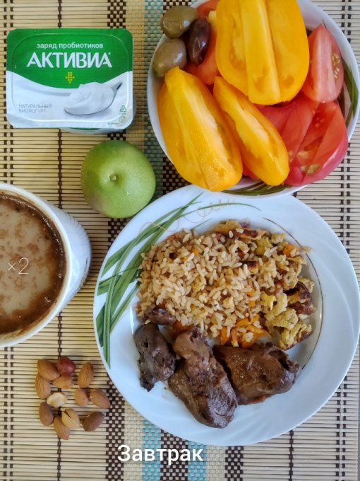 Завтрак: жареная куриная печень, рис с яйцом, помидоры, оливки, йогурт, орехи, груша, кофе с молоком.