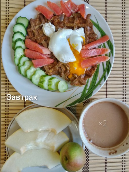 Завтрак: тыквенные вафли🧇, яйцо пашот, творожный сыр, форель, огурец, дыня, груша, кофе с молоком.