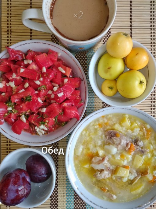 Обед: куриный суп со звездочками, помидоры🍅 с чесноком и оливковым маслом, яблоки, сливы, кофе с молоком.