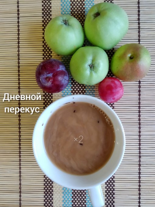 Дневной перекус: груша, яблоки, сливы, кофе с молоком.