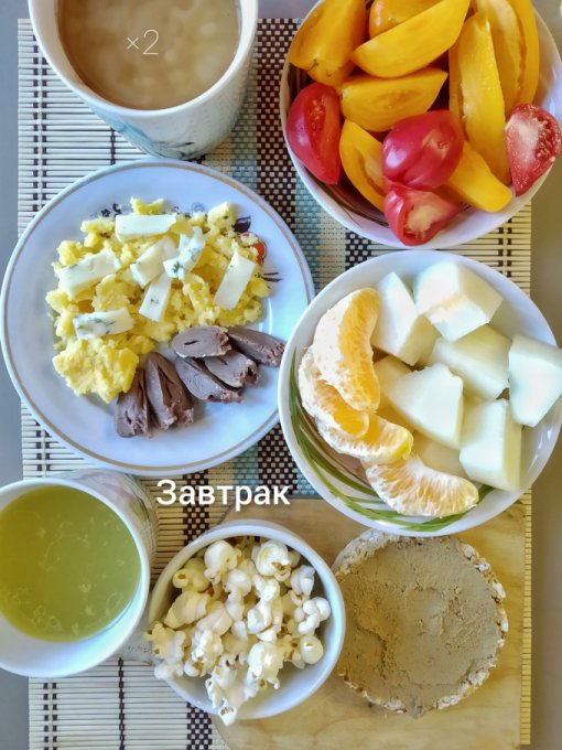 Завтрак: куриные сердечки, каша (полента, тыквенные сок, топленое масло, сыр с плесенью), хлебец с домашним паштетом, куриный бульон, соленый попкорн, помидоры, апельсин, дыня, кофе с молоком.