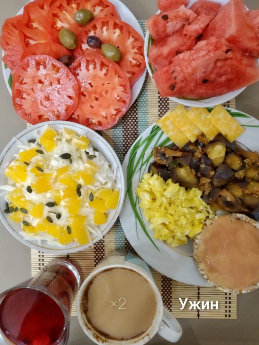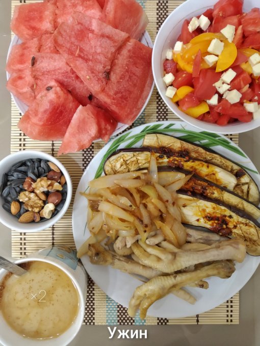 Ужин: куриные лапки, запеченные баклажаны с острым соусом, жареный лук (лук, кунжучное масло, икра минтая, соевый соус), помидоры с адыгейским сыром, арбуз, орехи, семечки, кофе с молоком.