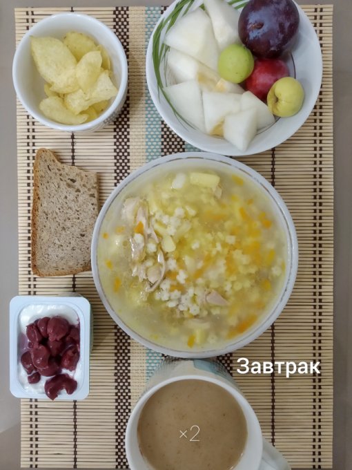 Завтрак: суп со звездочками, хлеб, йогурт с вишней в с/с, чипсы, сливы, яблоки, дыня, кофе с молоком.