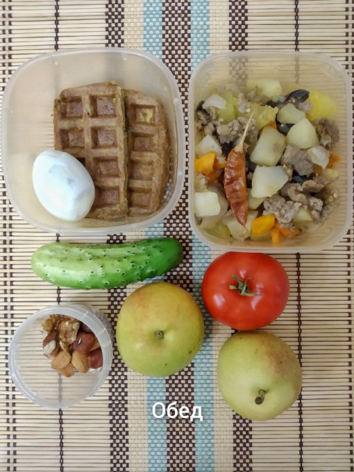Обед: овощное рагу с фаршем, тыквенная вафля, яйцо, помидор, огурец, груши, орехи.
