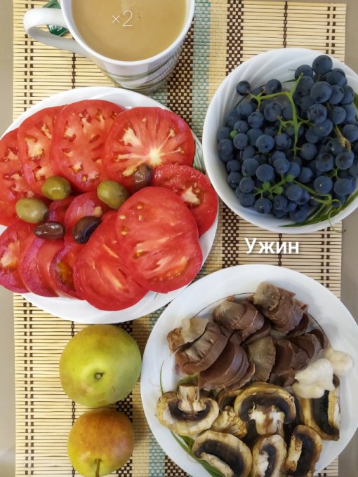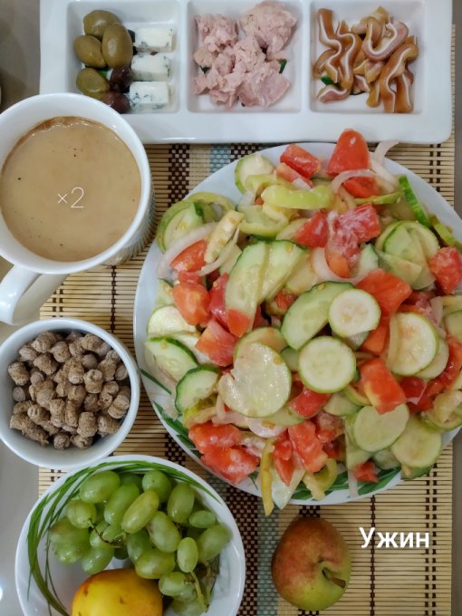 Ужин: овощной салат со сметаной, консервированный тунец, копчёные свиные уши, сыр с плесенью, оливки, ржаные отруби, виноград, нектарин, груша, кофе с молоком.