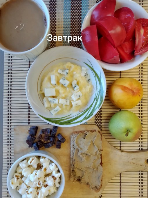 Завтрак: каша (полента, молоко, топлено масло), сыр с плесенью, колбаска из оленины, хлеб с домашним паштетом, помидор, попкорн, нектарин, груша, кофе с молоком.