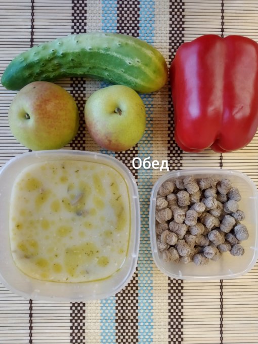 Обед: сырный суп с фрикадельками, ржаные отруби, перец, огурец, груши.