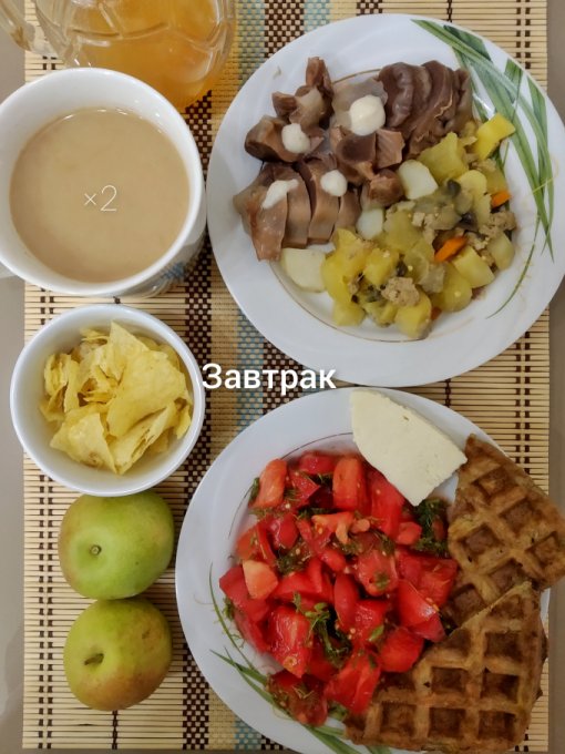 Завтрак: куриные желудки, овощное рагу с фаршем, хрен столовый, чипсы, овощной салат с маслом, адыгейский сыр, тыквенная вафля, груши, кофе с молоком и медом.