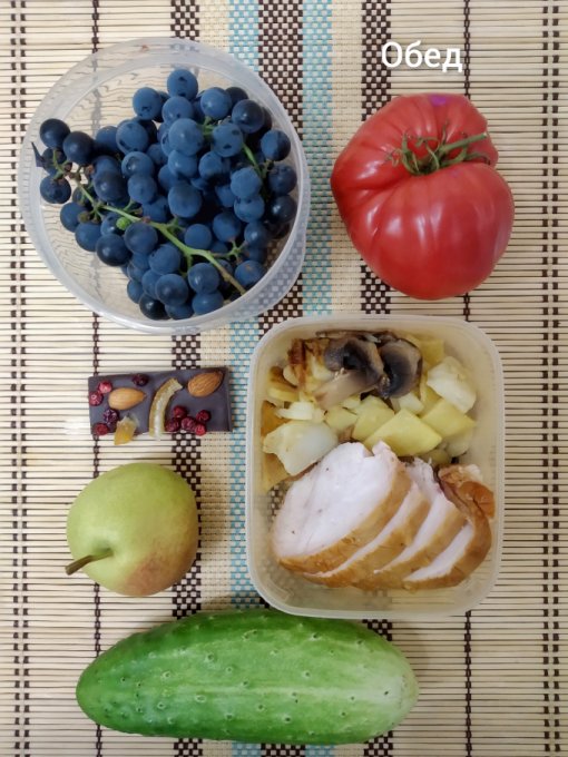Обед: копчёная куриная грудка, жареная картошка с грибами, шоколад, помидор, огурец, груша, виноград.