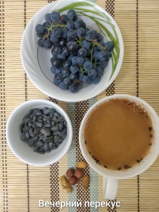 Вечерний перекус: виноград, семечки, орехи, кофе с молоком.