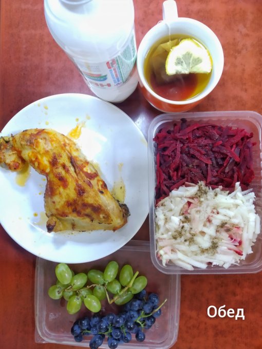 Обед: куриное бедро, салат (капуста кольраби, сырая свекла, масло), айран, чай с лимоном, виноград.
