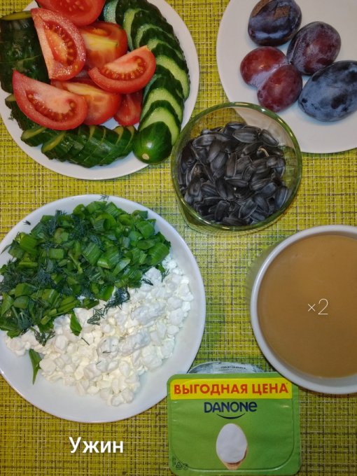 Ужин: творог, зелень, йогурт, помидоры, огурцы, сливы, семечки, кофе с молоком.