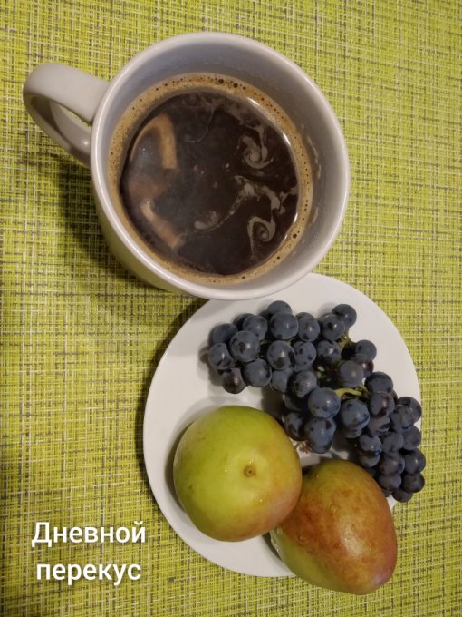 Дневной перекус: кофе, виноград, груши.