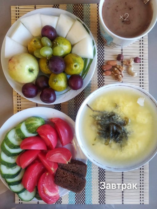 Завтрак: рыбный бульон с яйцом и морской капустой, хлеб, овощная нарезка, орехи, фрукты (сливы, груши, яблоко, дыня), кофе с молоком.
