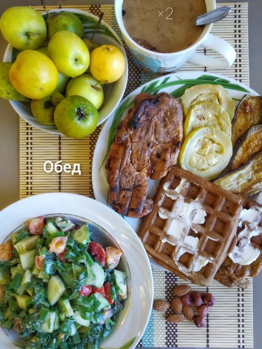 Обед: свинина, запечённый кабачок и баклажан, морковные вафли с творожным сыром, орехи, салат со сметаной, фрукты (яблоки, груши, нектарин), кофе с молоком.
