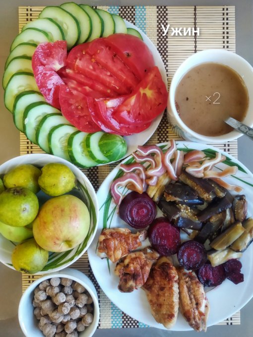 Ужин: куриные крылышки на гриле, свекла на гриле, жареные баклажаны, копчёные свиные уши, овощная нарезка, яблоки, груши, ржаные отруби, кофе с молоком.