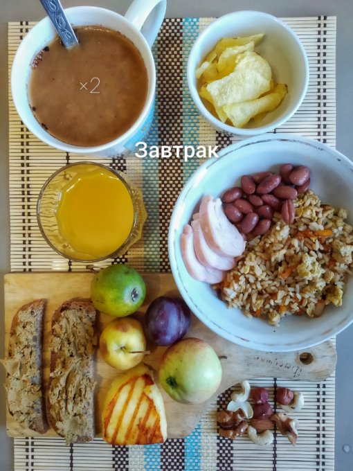 Завтрак: куриная грудка, жареный рис с яйцом, отварная фасоль, хлеб с домашним паштетом, адыгейский сыр на гриле, яблоки, груша, слива, орехи, чипсы, кофе с молоком.