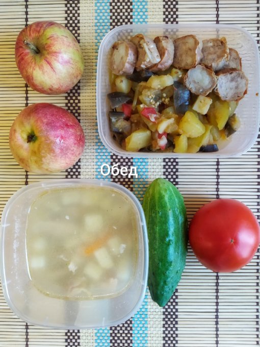 Обед: уха, свиная сосиска, овощное рагу (баклажан, кабачок, помидор, лук, картофель, масло), яблоки, овощи.
