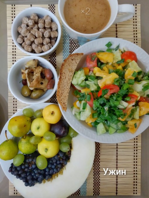 Ужин: овощной салат со сметаной, хлеб, соленые грибы, оливки, фруктовая тарелка (черноплодная рябина, дыня, яблоки, груши, слива, виноград), ржаные отруби, кофе с молоком.