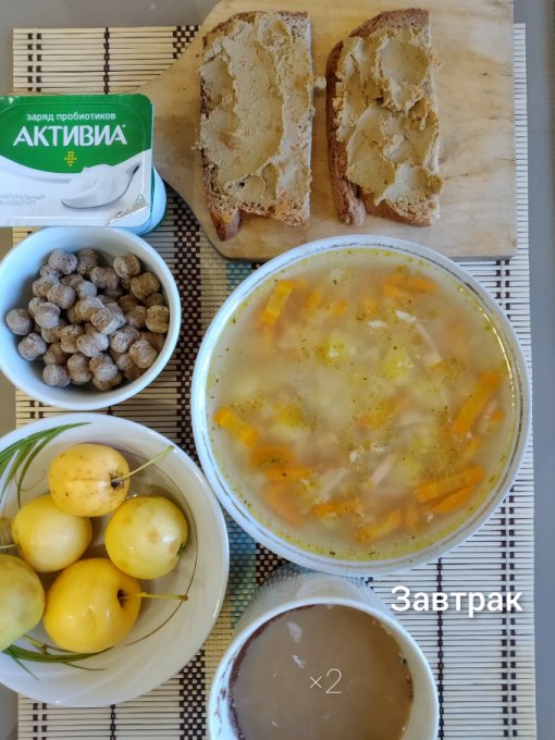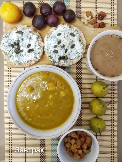 Завтрак: горохово-чечевичный суп с копчёной курицей, сухарики, бутерброды (гречневые хлебцы, творог, сметана, укроп, тыквенные семечки), сливы, нектарин, груши, орехи, кофе с молоком.