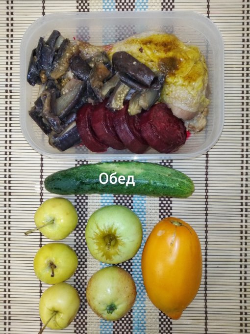 Обед: куриная голень, свекла на гриле, жареные баклажаны, яблоки, овощи.