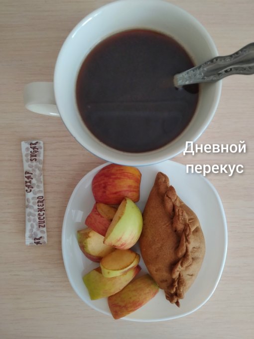 Дневной перекус: кофе с сахаром, яблоки, ржаной пирожок с яйцом и зелёным луком.