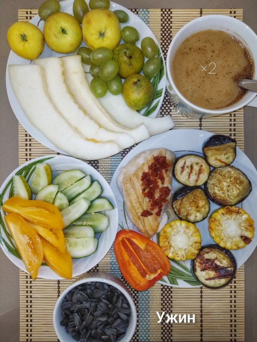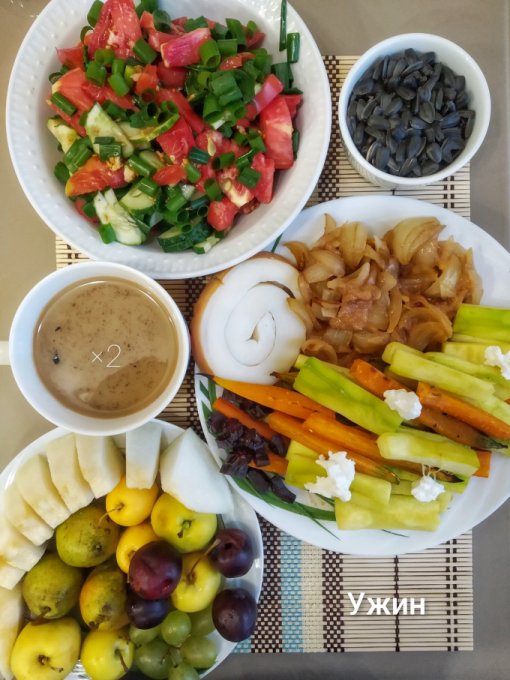 Ужин: кальмар г/к, колбаска из оленины, запечённые морковь и кабачок, творожный сыр, жареный лук (репчатый лук, кунжучное масло, икра минтая, соевое масло), овощной салат с оливковым маслом, семечки, фруктовая тарелка (дыня, виноград, яблоки, груши, сливы), кофе с молоком.