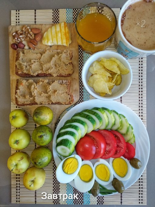 Завтрак: яйца, овощи, оливки, бутерброды с домашним паштетом, адыгейский сыр на гриле, орехи, чипсы, яблоки, груши, манговый сок, кофе с молоком.