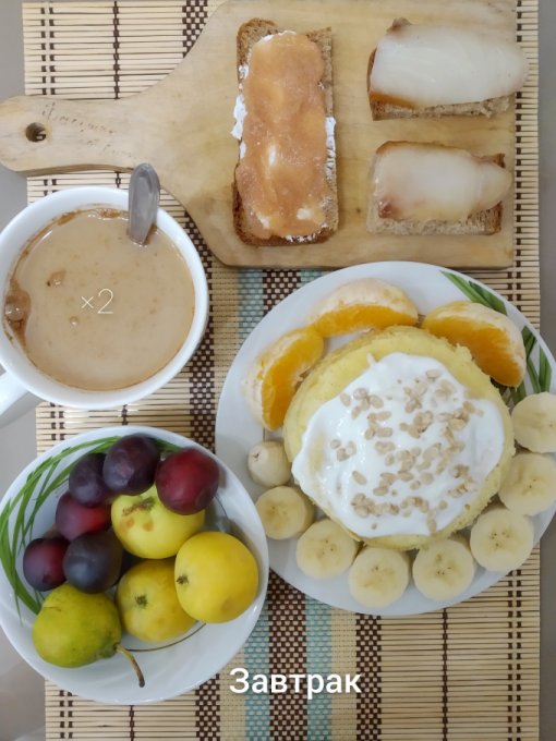 Завтрак: творожная запеканка в микроволновке, йогурт кедровый жмых, апельсин, банан, бутерброды (с масляной рыбой и творожным сыром с икрой), сливы, груша, яблоки, кофе с молоком.