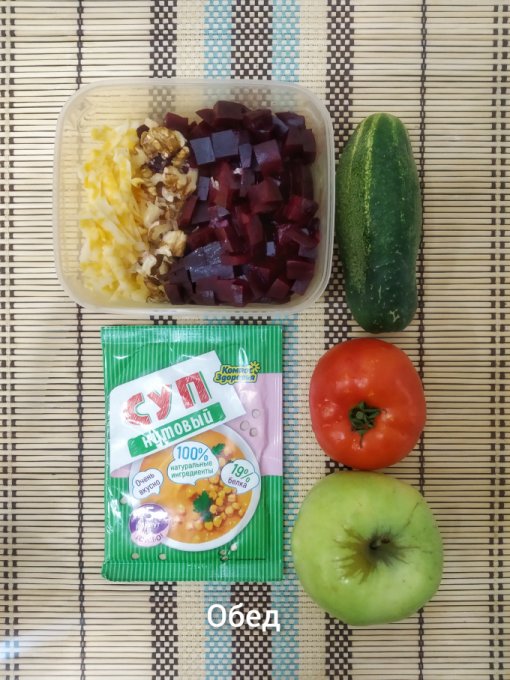 Обед: нутовый суп, салат (запеченная свекла, сыр, грецкий орех, оливковое масло), помидор, огурец, яблоко.