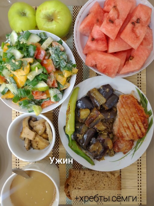 Ужин: свинина на гриле, жаренные баклажаны, перец чили на гриле, соленые грузди, овощной салат со сметаной, хлеб, хребты сёмги, яблоки, арбуз, кофе с молоком.