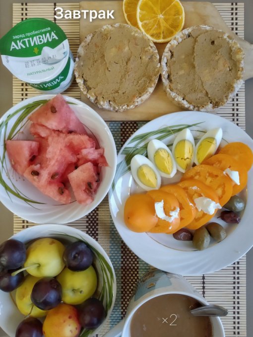 Завтрак: йогурт, яйцо, помидор, творожный сыр, оливки, хлебцы с домашним паштетом, сушёный апельсин, арбуз, сливы, яблоки, нектарин, кофе с молоком.