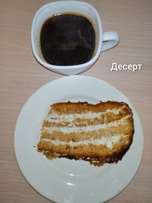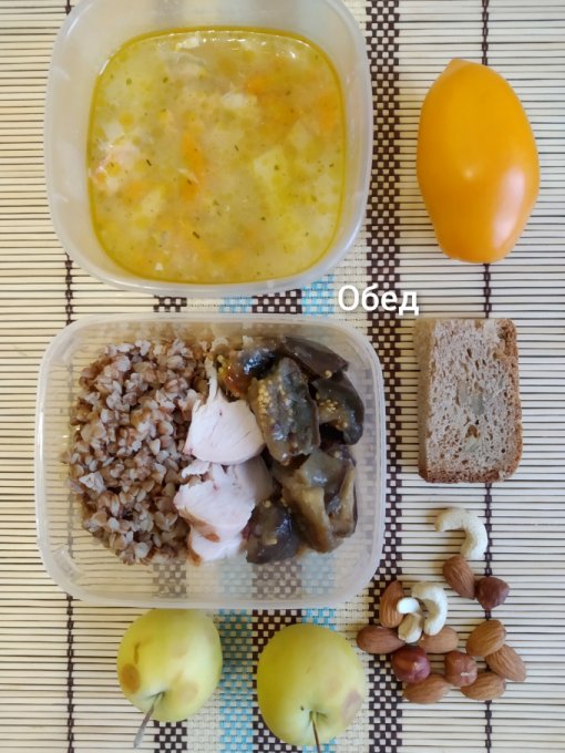 Обед: уха, копчёная куриная грудка, гречка, жареные баклажаны, хлеб, орехи, яблоки, торт🥧, кофе.