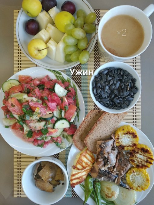 Ужин: консервированный тунец, адыгейский сыр и оващи на гриле, хлеб, овощной салат со сметаной, соленые грибы, фрукты, семечки, кофе с молоком.