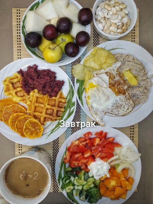 Завтрак: творожные вафли, лесная клубника, сушеные мандарины, ячневая каша с маслом, яйцо, чипсы, тыквенные семечки, овощной салат со сметаной 15%, дыня, сливы, яблоки, кофе с молоком.