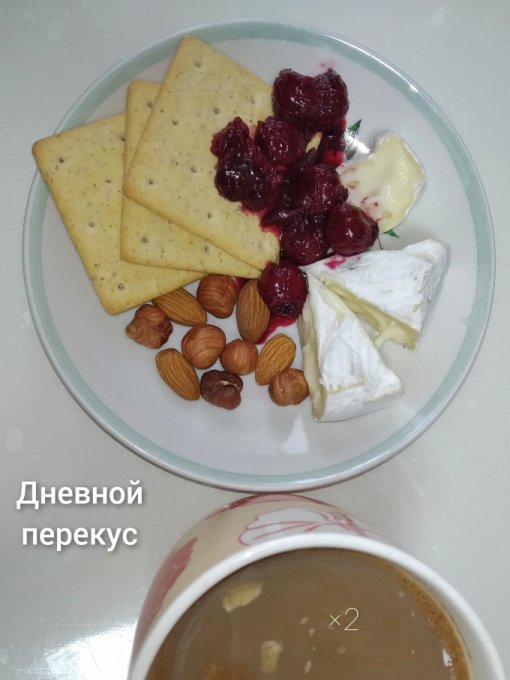 Дневной перекус: камамбер, вишневое варенье, крекеры, орехи, кофе с топленым молоком.