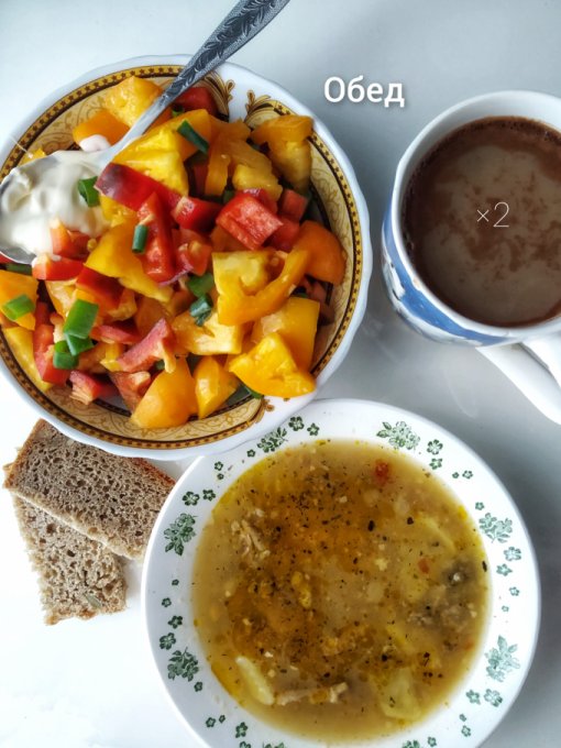 Обед: харчо, овощной салат с деревенской сметаной, хлеб, кофе с топленым молоком.