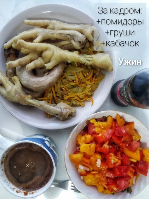 Ужин: куриные шеи и лапки🐔, закуска из огурцов и корейской моркови, овощной салат с маслом, соевый соус, помидоры, груши, кабачок, кофе с молоком.