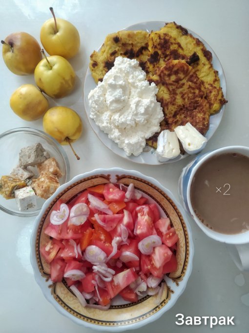 Завтрак: кабачковые оладьи, творог с деревенской сметаной, камамбер, овощной салат с маслом, халва, щербет из сухофруктов и орехов, яблоки, кофе с молоком.