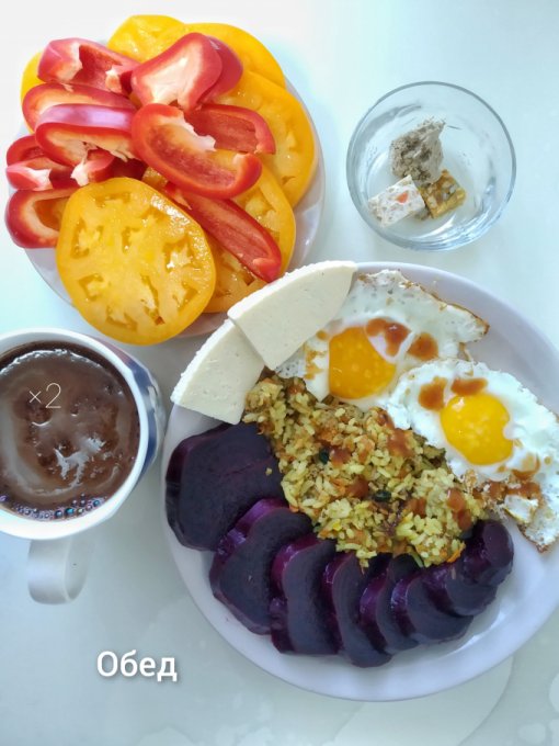 Обед: рис с фаршем, яйца, адыгейский сыр, свекла, соус барбекю, овощная нарезка, халва, щербет, кофе с молоком.