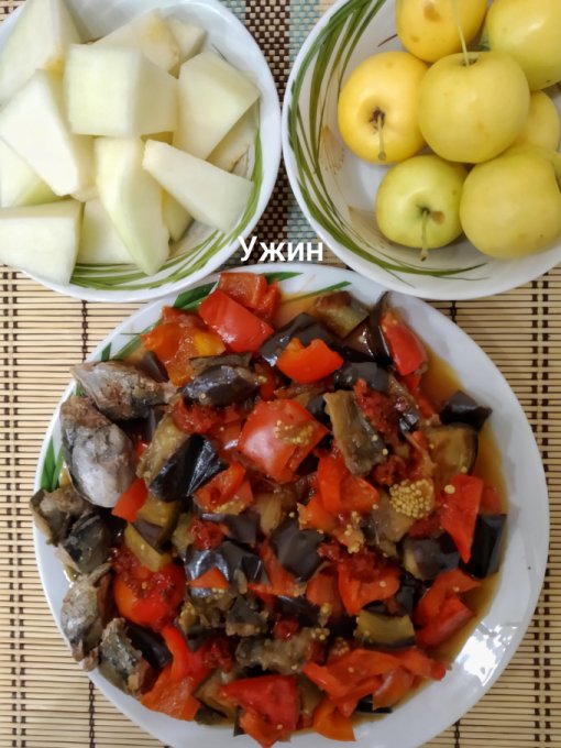 Ужин: жареные баклажаны с перцем, консервированный тунец, аджика, яблоки, дыня.