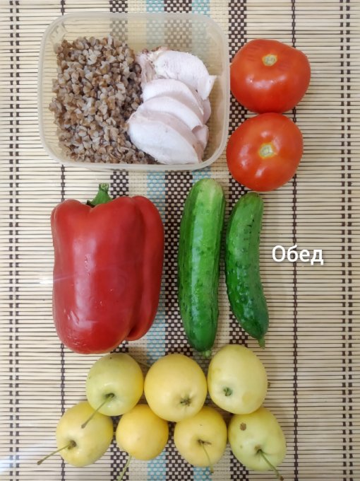 Обед: копченая куриная грудка, гречка, яблоки, огурец, помидоры, перец.