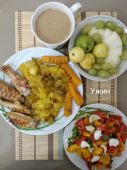 Ужин: куриные крылышки на гриле, морковь на гриле, тыква жаренная со свиным салом, овощной салат с творожным сыром и маслом виноградной косточки, дыня, виноград, груша, яблоки, кофе с молоком.