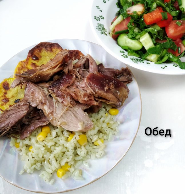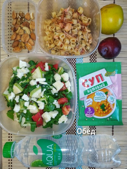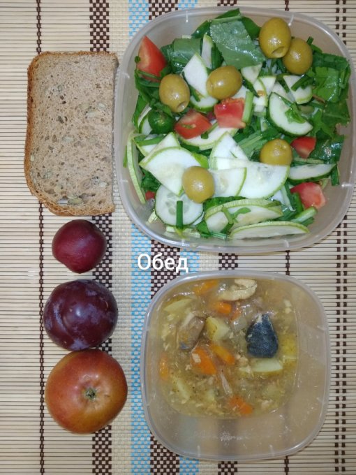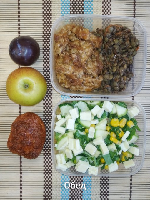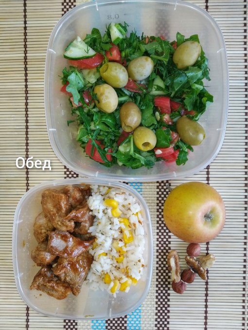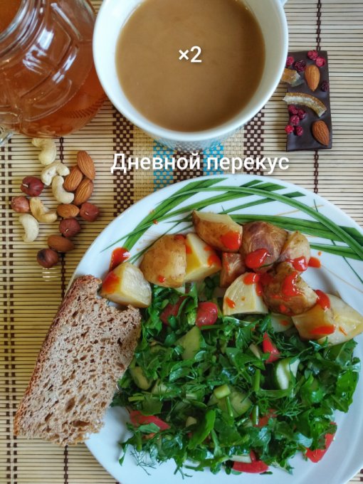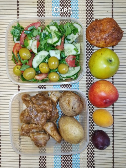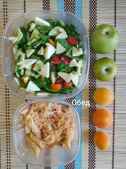 салат с оливковым маслом, творожный кекс, яблоко, нектарин,