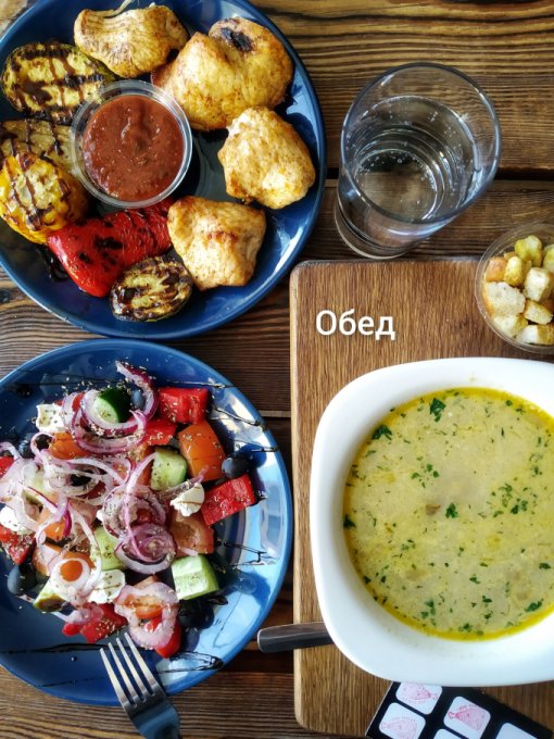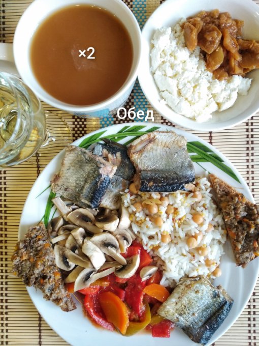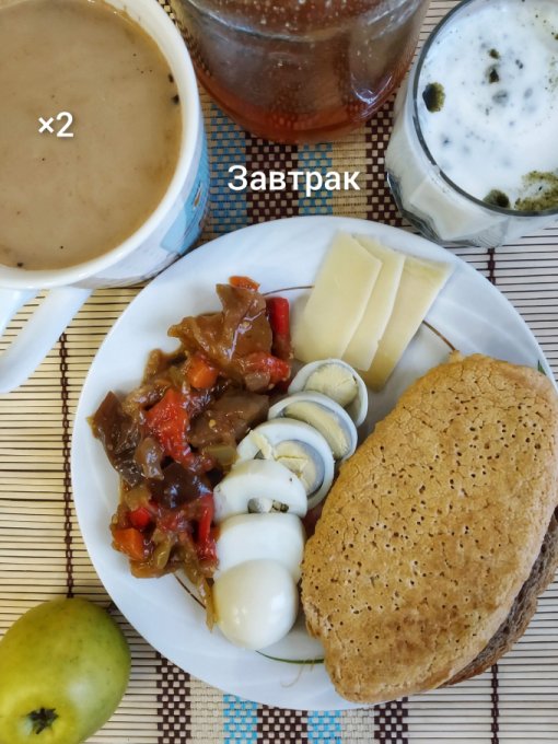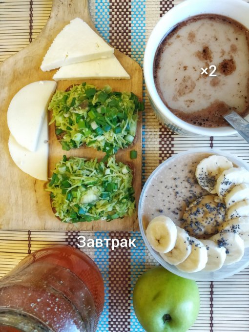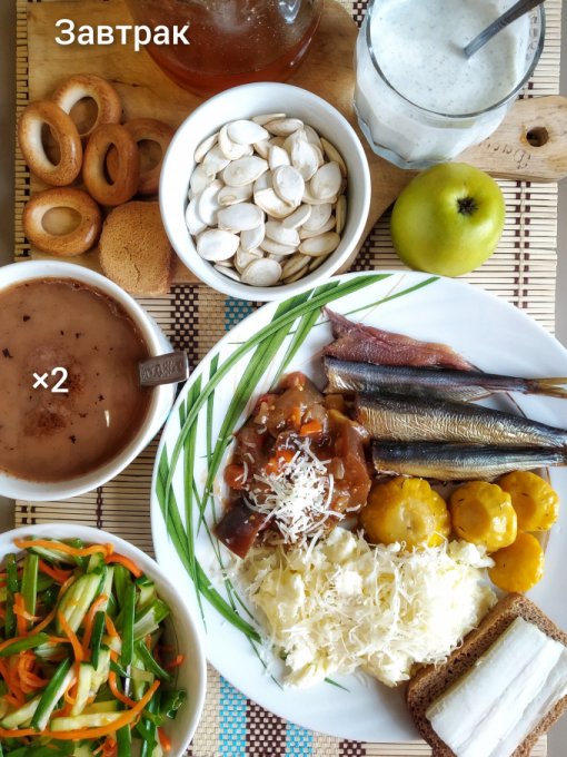 лук, масло), творог с черной смородиной и яблочным вареньем,