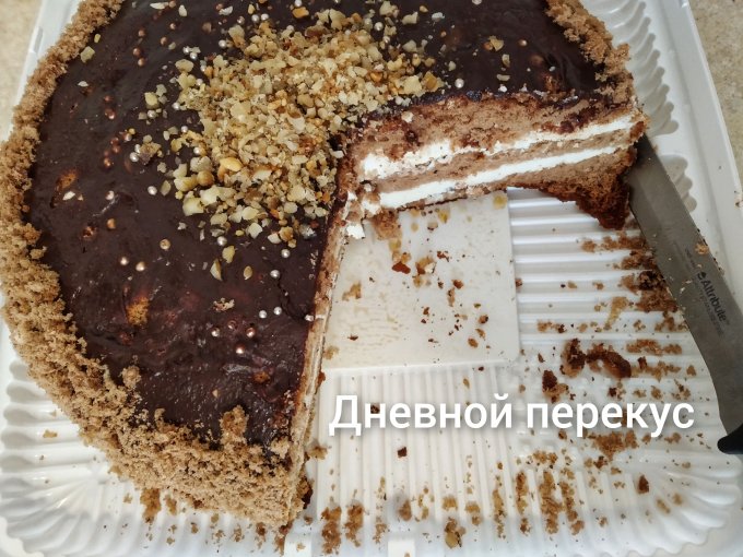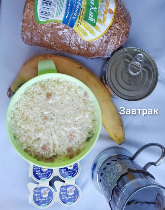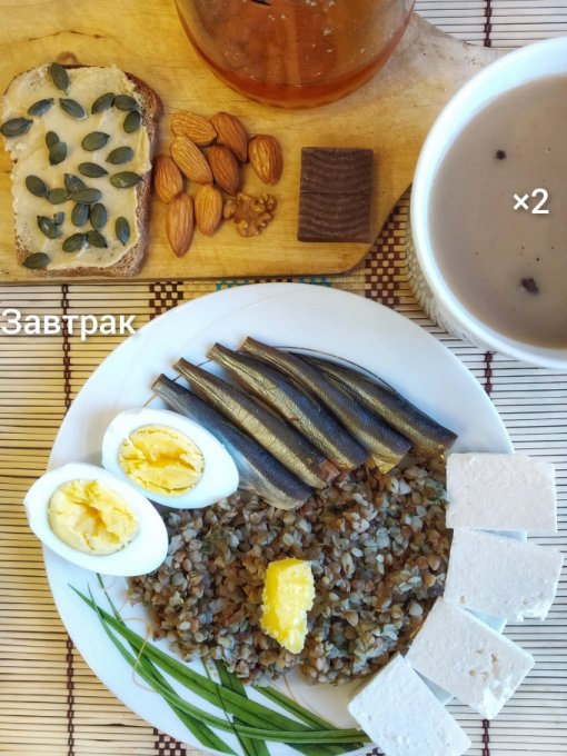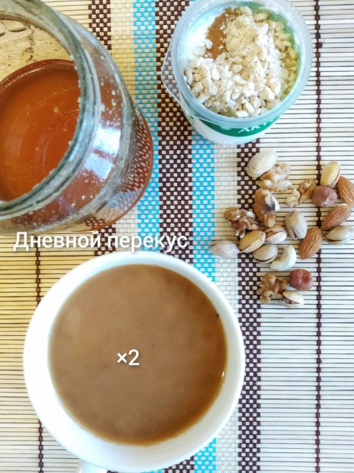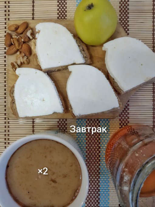 бутерброд с печенью минтая, йогурт, орехи, кофе с молоком.