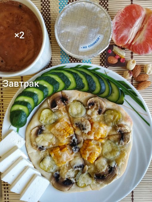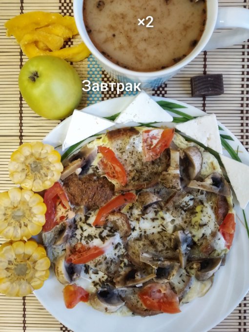 овощами, омлет (яйцо, 2 белка, молоко), пармезан, маринованные