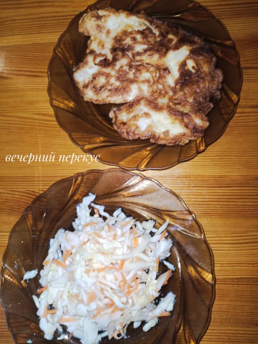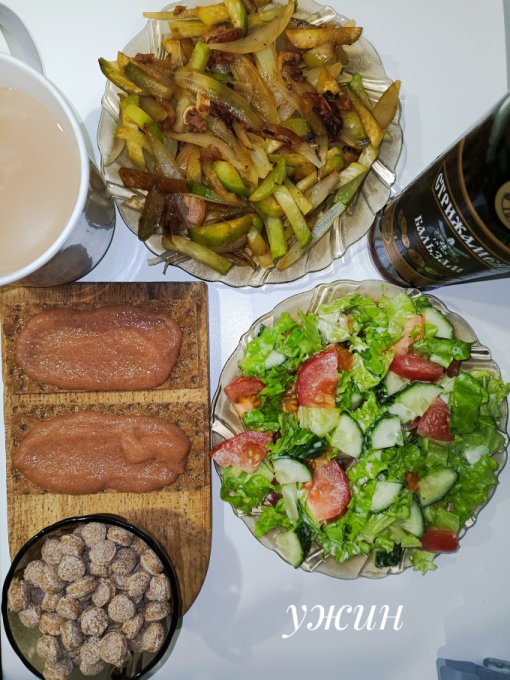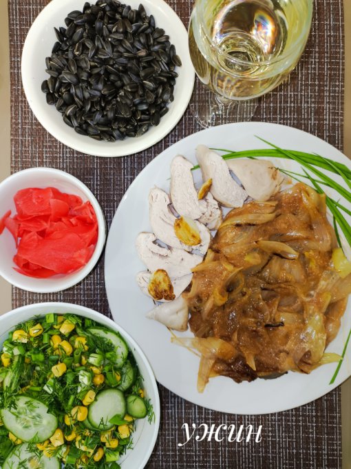 Ужин: отварное филе, жареный чеснок,