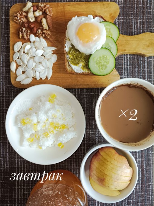 кокосовая стружка), кофе с молоком и медом.